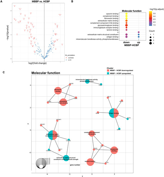 Analysis of differential regulation of proteins between MBBP and HCBP based on fold changes. (A) Volcano plot depicting differential protein abundance level between MBBP and HCBP. (B) Top 10 molecular functions for proteins differentially regulated between MBBP and HCBP. (C) Cnet plot of differentially regulated proteins and associated top 10 molecular functions. * = extracellular matrix conferring tensile strength.