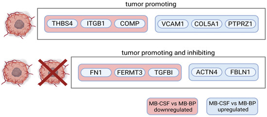 Graphic depiction of proteins with pro- or pro- and anti-tumorigenic potential differentially regulated between MBBP and MBCSF.