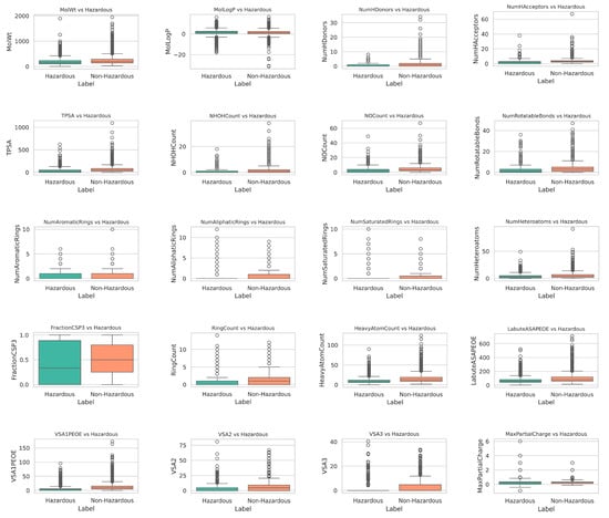 To validate the discriminative power of the selected molecular descriptors, we analyzed the distribution of 20 key descriptors between hazardous and non-hazardous chemicals. As shown in