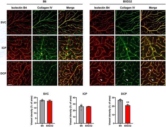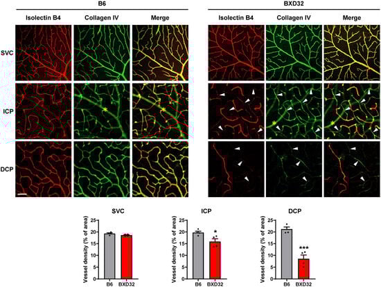 APA StyleXia, F., Shi, S., Buscho, S. E., Palacios, E., McCarty, M., Nazemi, M., Lu, L., Zhang, W., & Liu, H. (2025). Progressive Retinal Vascular and Neuronal Degeneration in BXD32 Mice: A Model for Age-Dependent Neurovascular Pathology. International Journal of Molecular Sciences, 26(19), 9289. https://doi.org/10.3390/ijms26199289