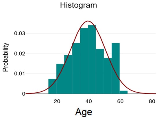 Distribution of the age variable—green bars represent the histogram of observed age values (frequency counts), the red line depicts the fitted normal distribution curve, showing how closely the data follows a normal distribution.