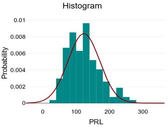 Distribution of the blood platelet/lymphocyte ratio (PRL) variable—green bars represent the histogram of observed PRL values (frequency counts), the red line depicts the fitted normal distribution curve, showing how closely the data follows a normal distribution.