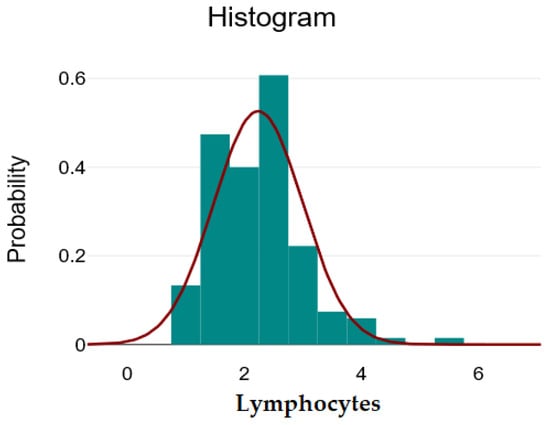 Distribution of the lymphocytes variable—green bars represent the histogram of observed Lymphocytes values (frequency counts), the red line depicts the fitted normal distribution curve, showing how closely the data follows a normal distribution.