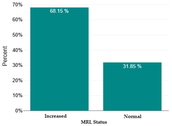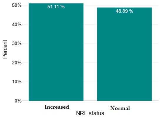 In Figure 4, Figure 5, Figure 6 and Figure 7, we show the bar charts that visually illustrate the percentage of patients with elevated RNL, RML, SII, and PCR values, respectively, compared to the percentage of patients with normal values (below the upper limit), according to the clinical reference values mentioned in the Section 4.