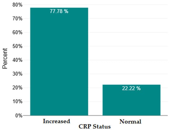 Recent studies have identified several acute-phase proteins that are significantly altered in schizophrenia and acute psychosis, indicating the presence of an inflammatory component in these disorders. C-reactive protein (CRP) is a major marker of inflammation, synthesized by the liver in response to cytokine stimulation []. A study evaluating 174 individuals with acute psychosis found that 59.8% of them had elevated CRP levels, which remained high throughout their hospitalizations. Among patients with schizophrenia, 43% had elevated CRP levels, compared with 20% among healthy individuals in the control group. The study also reported that elevated CRP levels were associated with poorer cognitive performance and reduced cortical thickness []. Other acute-phase proteins that have been found to be significantly elevated in schizophrenia are fibrinogen, haptoglobin, complement components C3 and C4, alpha-1-acid glycoprotein, and hemopexin [].