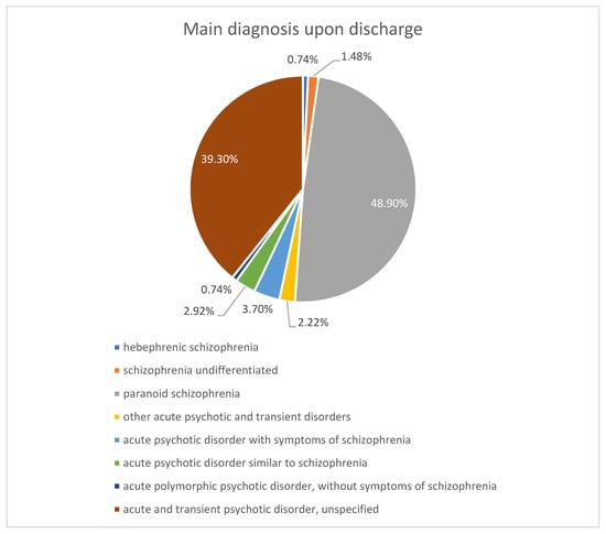 From a diagnostic point of view, most patients in the schizophrenia group have a diagnosis of paranoid schizophrenia, and most patients with acute psychotic disorder have a diagnosis of acute and transient psychotic disorder, unspecified. These proportions reflect the normal distribution observed in clinical practice. Figure 8 shows the exact diagnoses and their proportion in the study group.