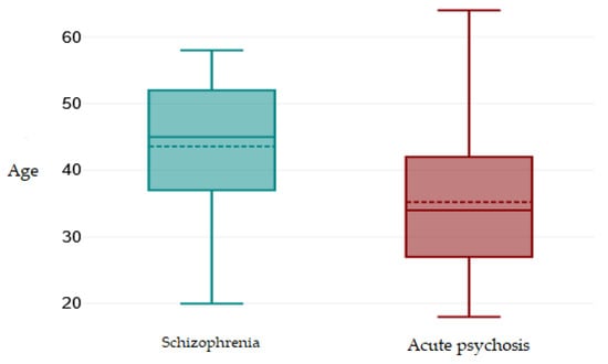 Given the normal distribution of age in both groups, we compared the two groups using the t-test for independent samples. Patients with acute psychotic disorder are significantly younger than those with schizophrenia (p = <0.001, 95% confidence interval [4.83–11.87]), reflecting the normal pattern of presentation of the first psychotic episode at younger ages. Figure 9 visually illustrates this difference.