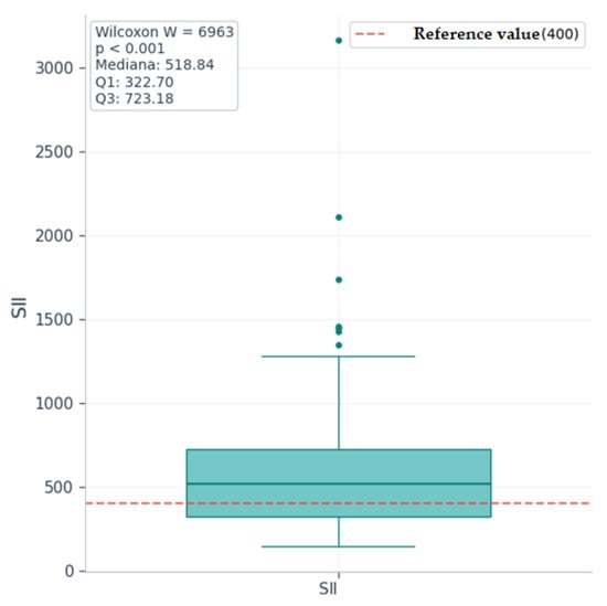 Boxplot for systemic immune–inflammatory index (SII) values with Wilcoxon test results.