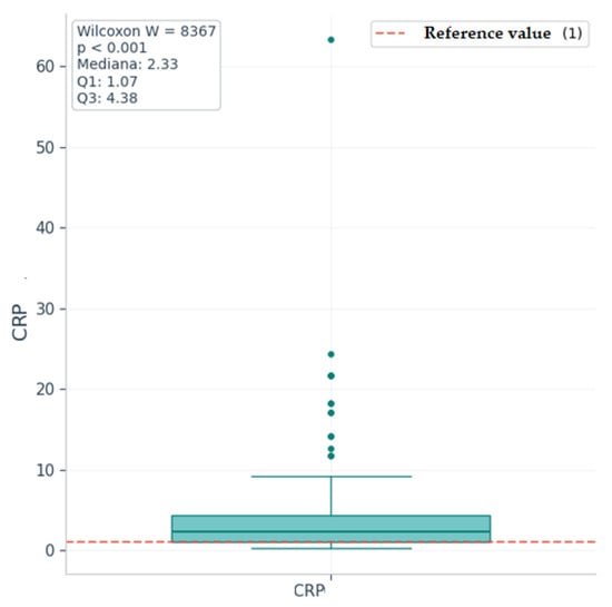 Boxplot for C-reactive protein (CRP) values with Wilcoxon test results.