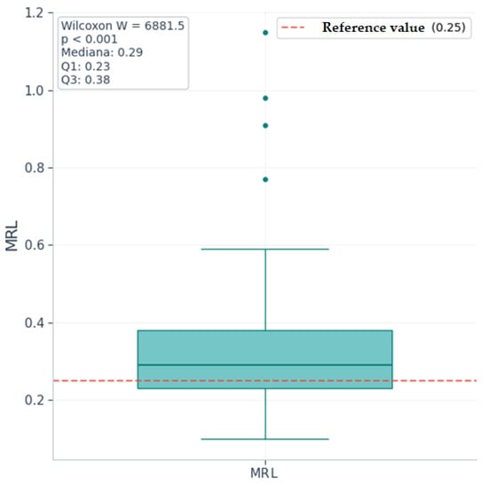 Wilcoxon tests with a theoretical mean equal to the upper normal limit showed that the median values of the SII, CRP, and MRL markers are significantly higher than the reference values (p < 0.0125). The statistical difference is very significant, even after Bonferroni correction for multiple tests, given the p-value < 0.001; the median value of NRL is not significantly higher than the upper reference value (p = 0.089).