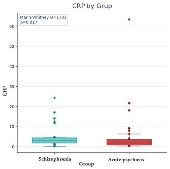 Figure 13 shows the boxplot graph for CRP values according to diagnostic group, with the results of the Mann–Whitney U test (U, p). It can be seen that CRP values have a higher median in the schizophrenia group compared to the acute psychosis group. Although the boxplot suggests a tendency for a difference in the central position of CRP values, this was not supported by statistical significance after applying the Bonferroni correction.