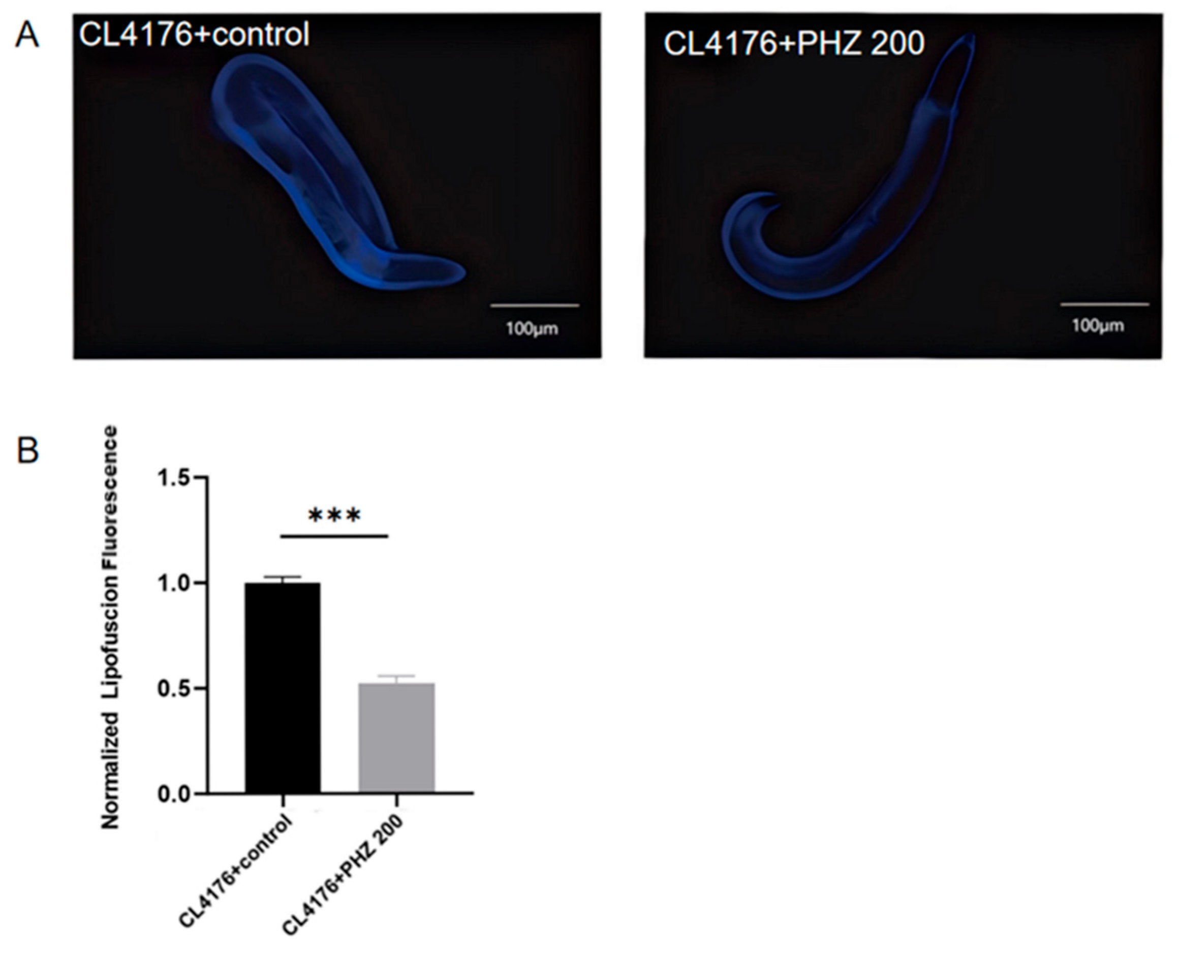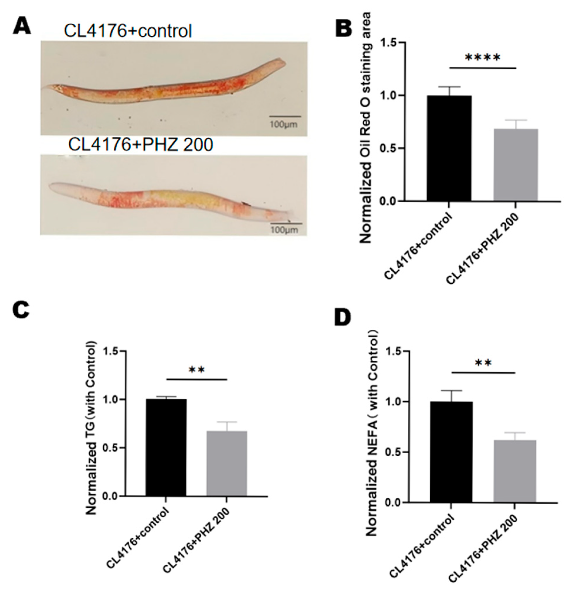 2.6. PHZ Reduces Lipid Accumulation in Transgenic C. elegans CL4176