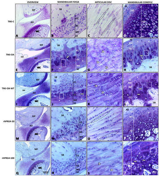 Temporomandibular joint of rabbit (Oryctolagus cuniculus). TMJ-C: healthy temporomandibular joints as a control group (A–D); TMJ-OA: temporomandibular joint with osteoarthritis (E–H); TMJ-OA-WT: osteoarthritic temporomandibular joint without treatment and evaluated at 30 days after treatment period (I–L); rhPRG4-30: TMJ-OA joint treated with rhPRG4 30 μg/mL and assessed 30 days after the treatment (M–P); rhPRG4-100: TMJ-OA treated with rhPRG4 100 μg/mL and evaluated 30 days after treatment (Q–T); MC: mandibular condyle; AD: articular disc; M: mandibular fossa; SZ: superficial zone; MZ: middle zone; DZ: deep zone; CC: calcified cartilage; SB: subchondral bone; dotted line area: chondrocytes arranged in clusters parallel to the collagen fibers; grid area: chondron clustering near deep fibrillation; asterisk: heterogeneous matrix texture; arrowhead: disorganized collagen fibers; arrow: deep fibrillation. Toluidine Blue stain.