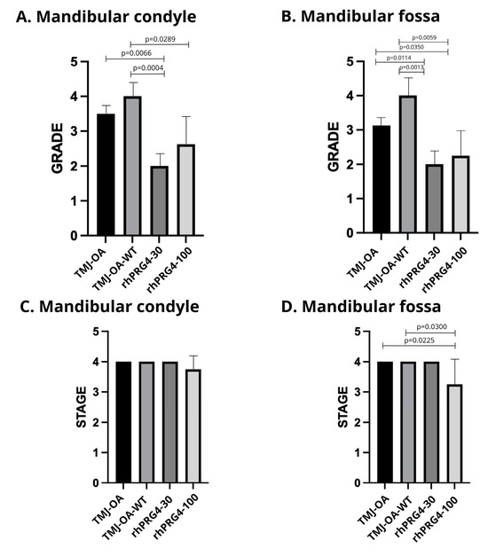 OARSI scale score to evaluate the histopathology of osteoarthritic cartilage in the condyle and mandibular fossa of the temporomandibular joint of the rabbit (Oryctolagus cuniculus). (A) grade scores of the mandibular condyle; (B) grade scores of the mandibular fossa; (C) stage scores of the mandibular condyle; (D) stage scores of the mandibular fossa; TMJ-OA: temporomandibular joint with osteoarthritis; TMJ-OA-WT: osteoarthritic temporomandibular joint without treatment and evaluated at 30 days after treatment period; rhPRG4-30: TMJ-OA joint treated with rhPRG4 30 μg/mL and assessed 30 days after the treatment; rhPRG4-100: TMJ-OA treated with rhPRG4 100 μg/mL and evaluated 30 days after treatment. GraphPad Prism version 5.00. Significant statistical differences p < 0.05.