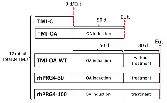 Experimental design and grouping of temporomandibular joints (TMJs) in rabbits. Twelve rabbits (24 TMJs) were divided into five groups. TMJ-C: healthy temporomandibular joints as a control group; TMJ-OA: osteoarthritic temporo-mandibular joint; TMJ-OA-WT: osteoarthritic temporomandibular joint untreated and evaluated 30 days after treatment period; rhPRG4-30: osteoarthritic temporomandibular joint treated with rhPRG4 30 μg/mL and assessed 30 days after treatment; rhPRG4-100: osteoarthritic temporo-mandibular joint treated with rhPRG4 100 μg/mL and evaluated 30 days after treatment. d: days; Eut.: euthanasia.