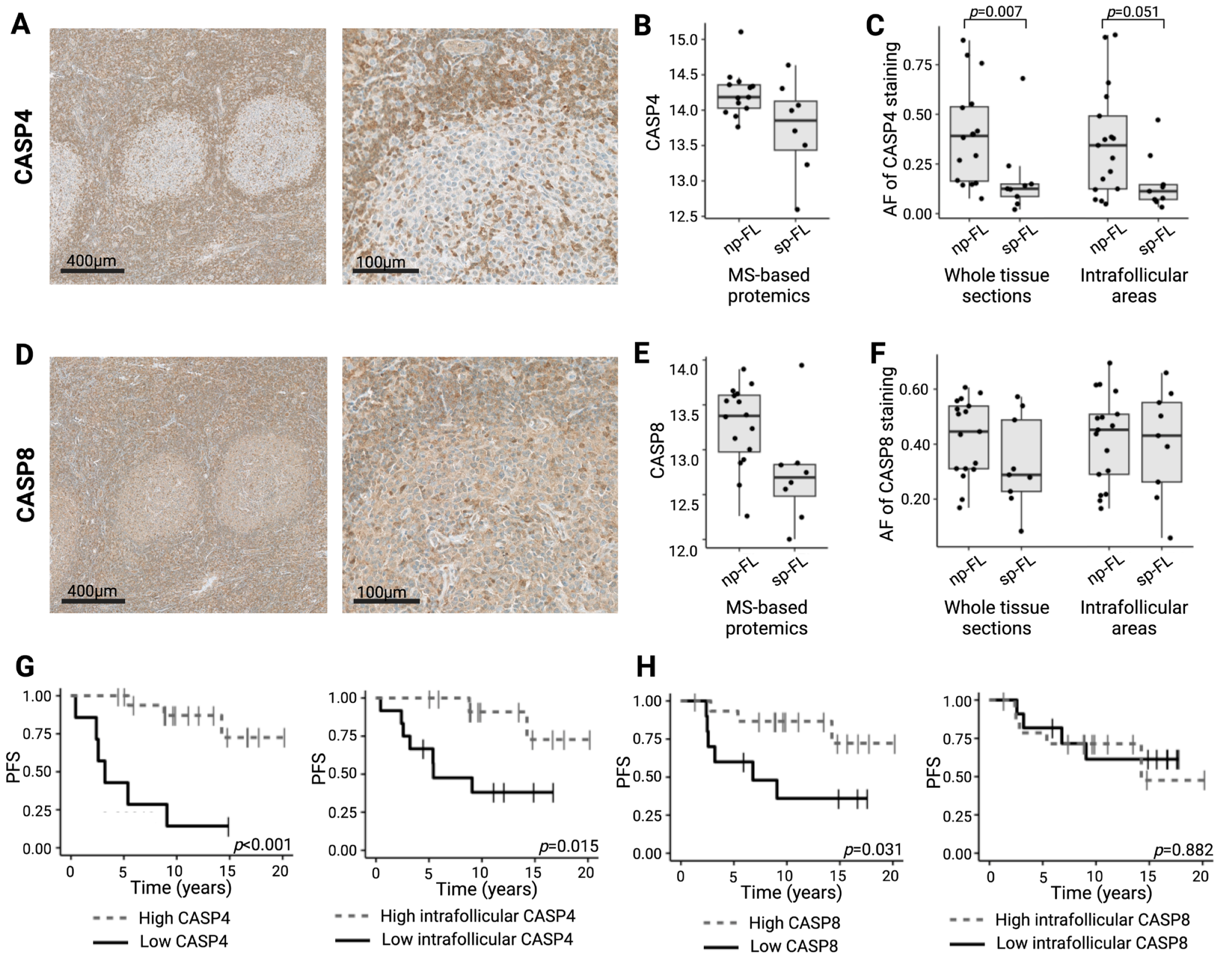 - Enemark, M.B.H.; Wolter, K.; Campbell, A.J.; Andersen, M.D.; Sørensen, E.F.; Hybel, T.E.; Madsen, C.; Lauridsen, K.L.; Plesner, T.L.; Hamilton-Dutoit, S.J. Proteomics identifies apoptotic markers as predictors of histological transformation in patients with follicular lymphoma. Blood Adv. 2023, 7, 7418–7432. [Google Scholar] [CrossRef] [PubMed]