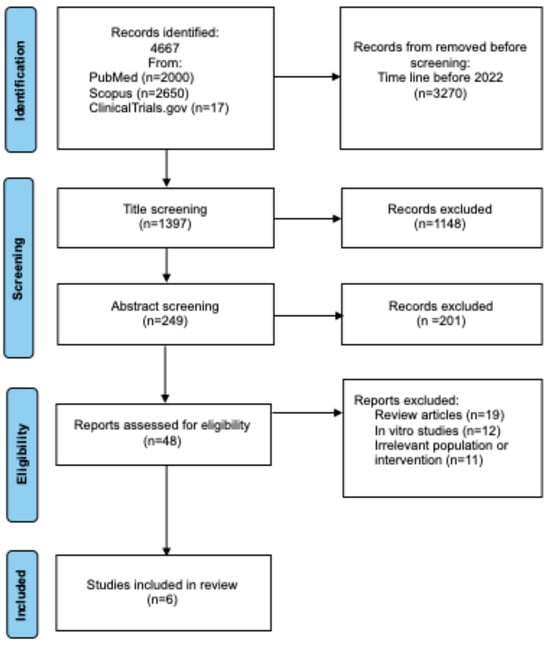 A systematic database search identified 4667 records. Of these, 3270 were excluded for being published before 2022. The remaining 1397 records underwent title screening, during which 1148 were excluded as irrelevant. Subsequently, 249 abstracts were reviewed, and 201 were excluded. The full texts of 48 articles were then assessed for eligibility. Following detailed evaluation, 42 studies were excluded for not meeting the inclusion criteria. Ultimately, 6 studies fulfilled all criteria and were incorporated into the final analysis. The comprehensive data selection and identification process is illustrated in Figure 1.