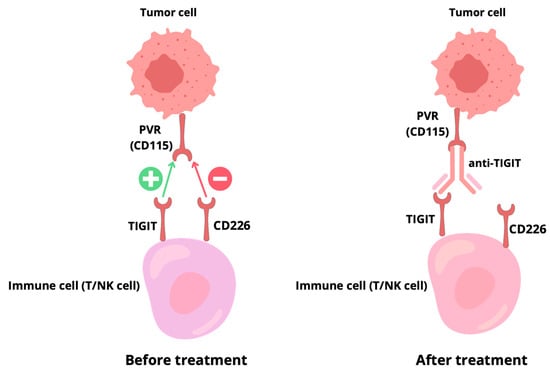 PVR is constitutively present on epithelial and myeloid cells, and its expression is greatly increased in the tumor environment, particularly in tumor cells and tumor-associated myeloid cells []. High PVR levels are associated with poorer clinical response to anti-PD-1 immunotherapy in both metastatic melanoma and non-small-cell lung cancer, and the combined assessment of PVR and PD-L1 may be predictive of treatment efficacy [].