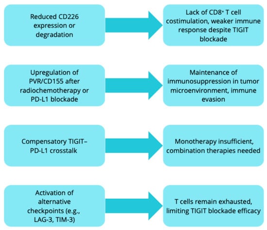 As summarized in Figure 3, multiple mechanisms can limit the efficacy of TIGIT inhibition in NSCLC, highlighting the need for rational combination strategies to overcome resistance.