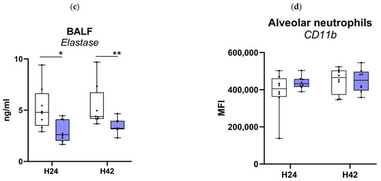 | Alveolar CXCL2 (pg/mL) | 615 (536–751) | 443 (327–501) ** | 582 (523–705) | 511 (466–578) * |