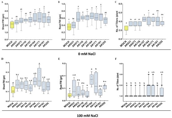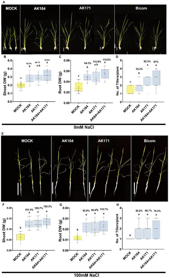 2.3. AK164, AK171, and BiCom Enhance Rice Growth Under Hydroponic Normal and Salt Stress Conditions
