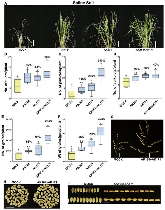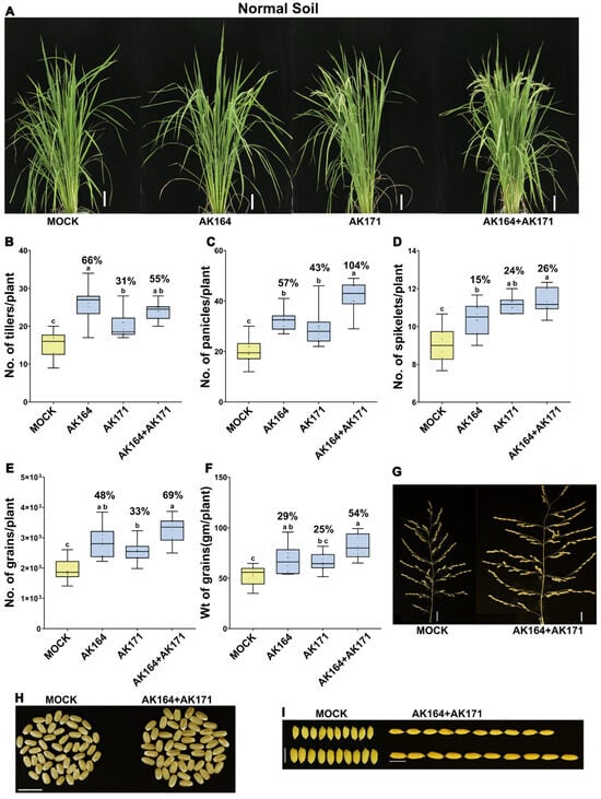 2.4. AK164 and AK171 Enhance Soil-Grown Rice Performance and Yield