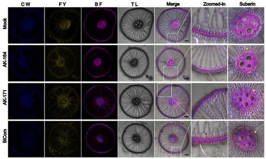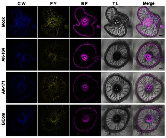 2.6. AK164 and AK171 Promote the Deposition of Secondary Cell Wall Components in Colonized Rice