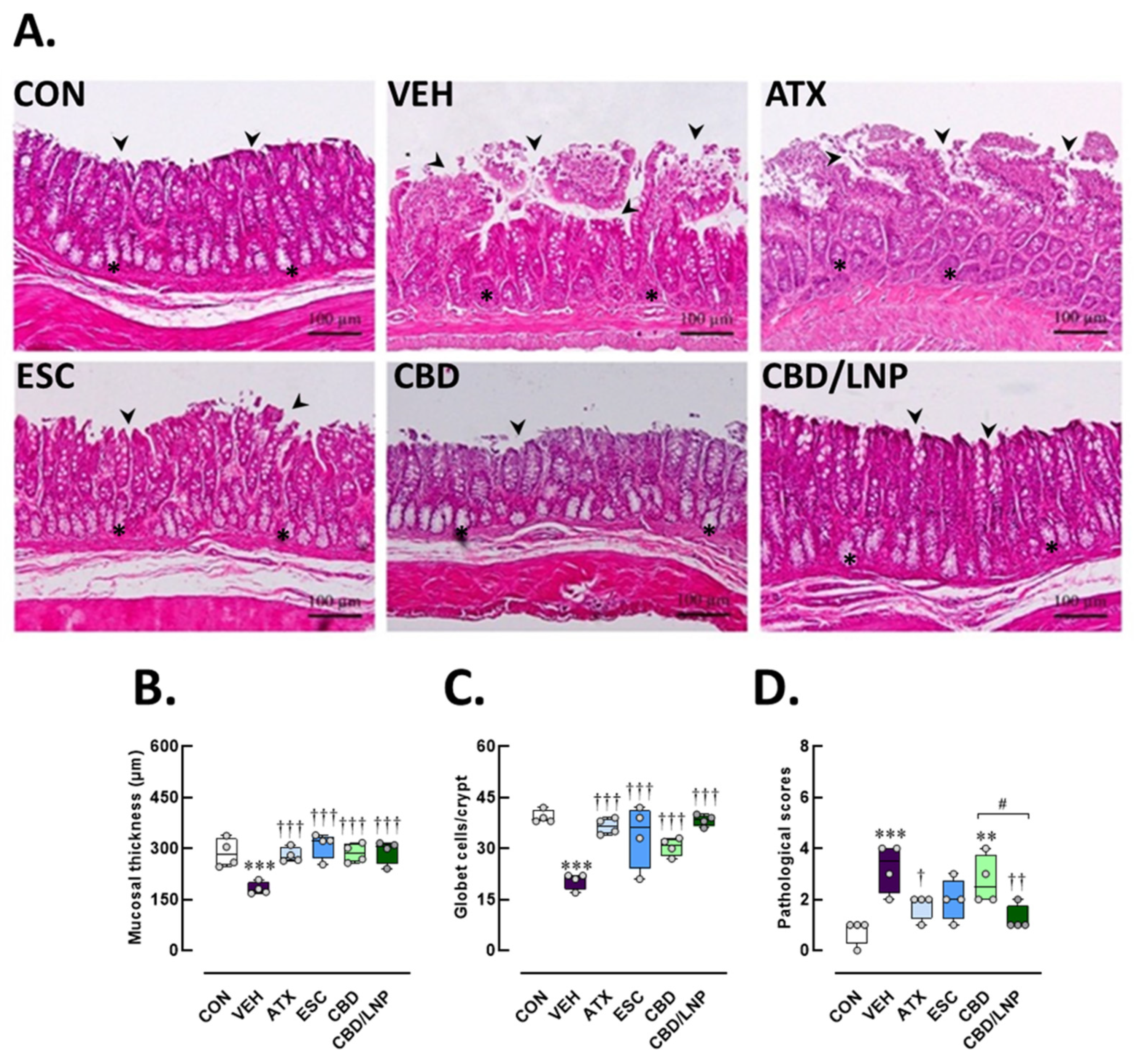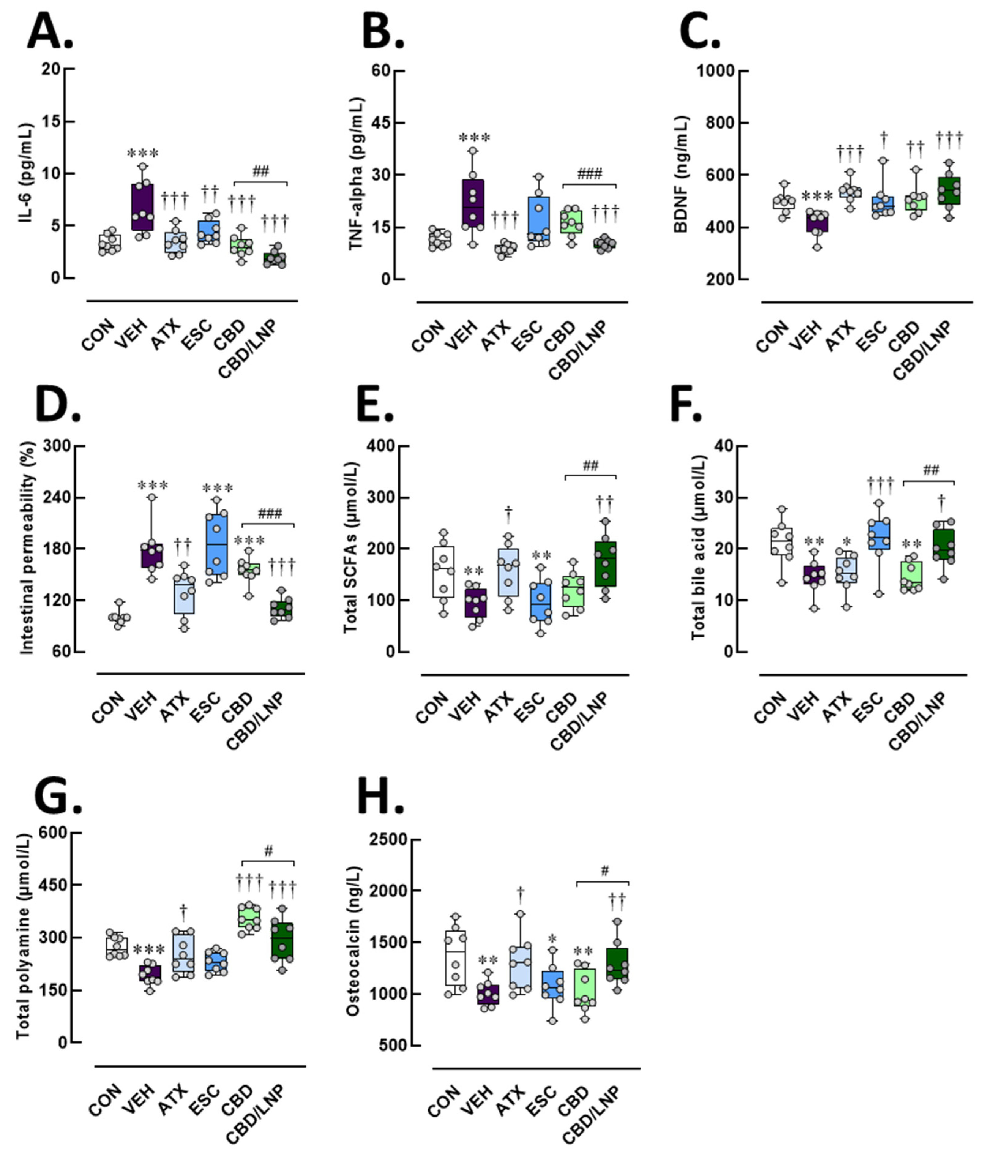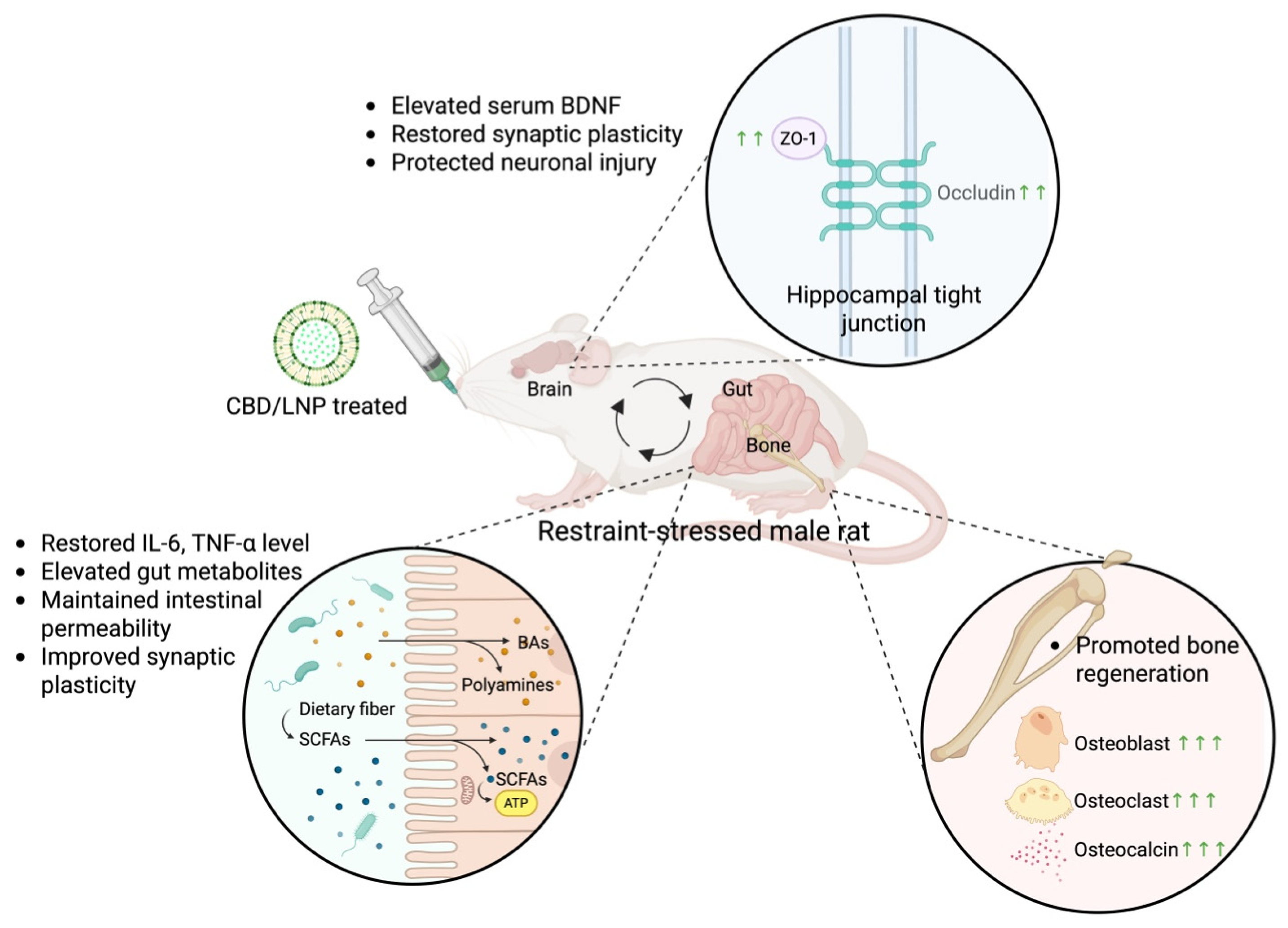 Lapmanee, S.; Lumsutti, J.; Charoenphon, N.; Inchan, A.; Boonmuen, N.; Wongchitrat, P.; Thonapan, N.; Yuajit, C.; Surinlert, P.; Tipbunjong, C.; et al. Cannabidiol Lipid Nanoparticles Stabilize Gut–Brain–Bone Axis Integrity and Enhance Neuroplasticity in Stressed Rats: A Comparison with Atomoxetine and Escitalopram. Int. J. Mol. Sci. 2025, 26, 9318. https://doi.org/10.3390/ijms26199318