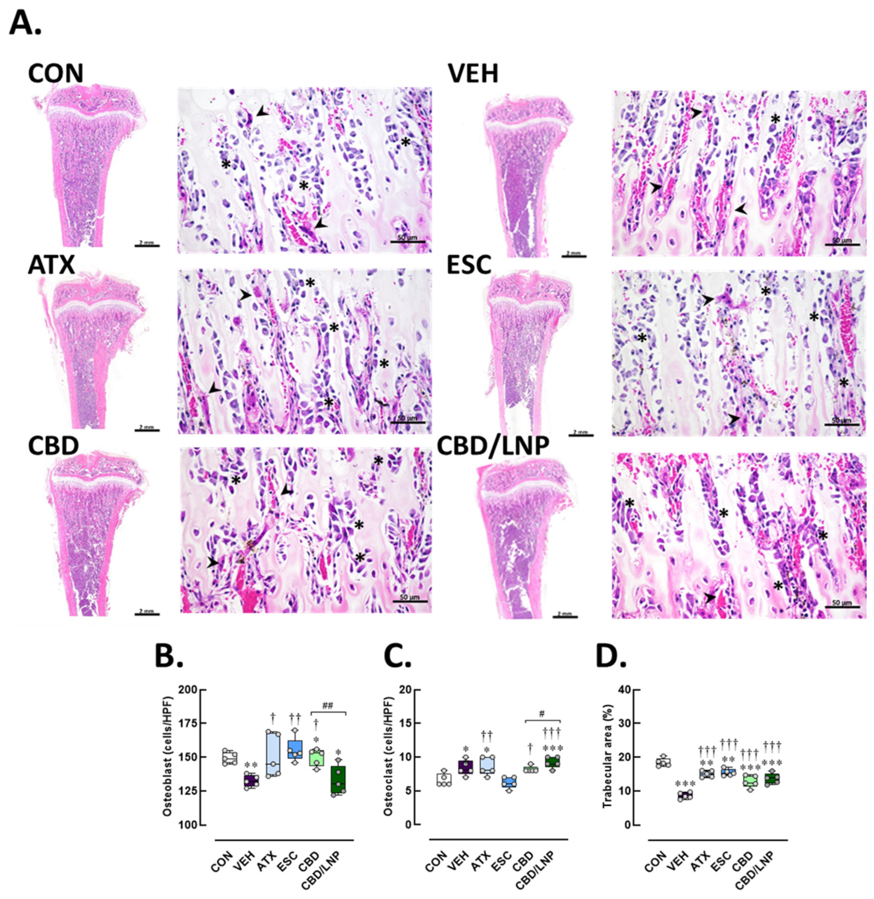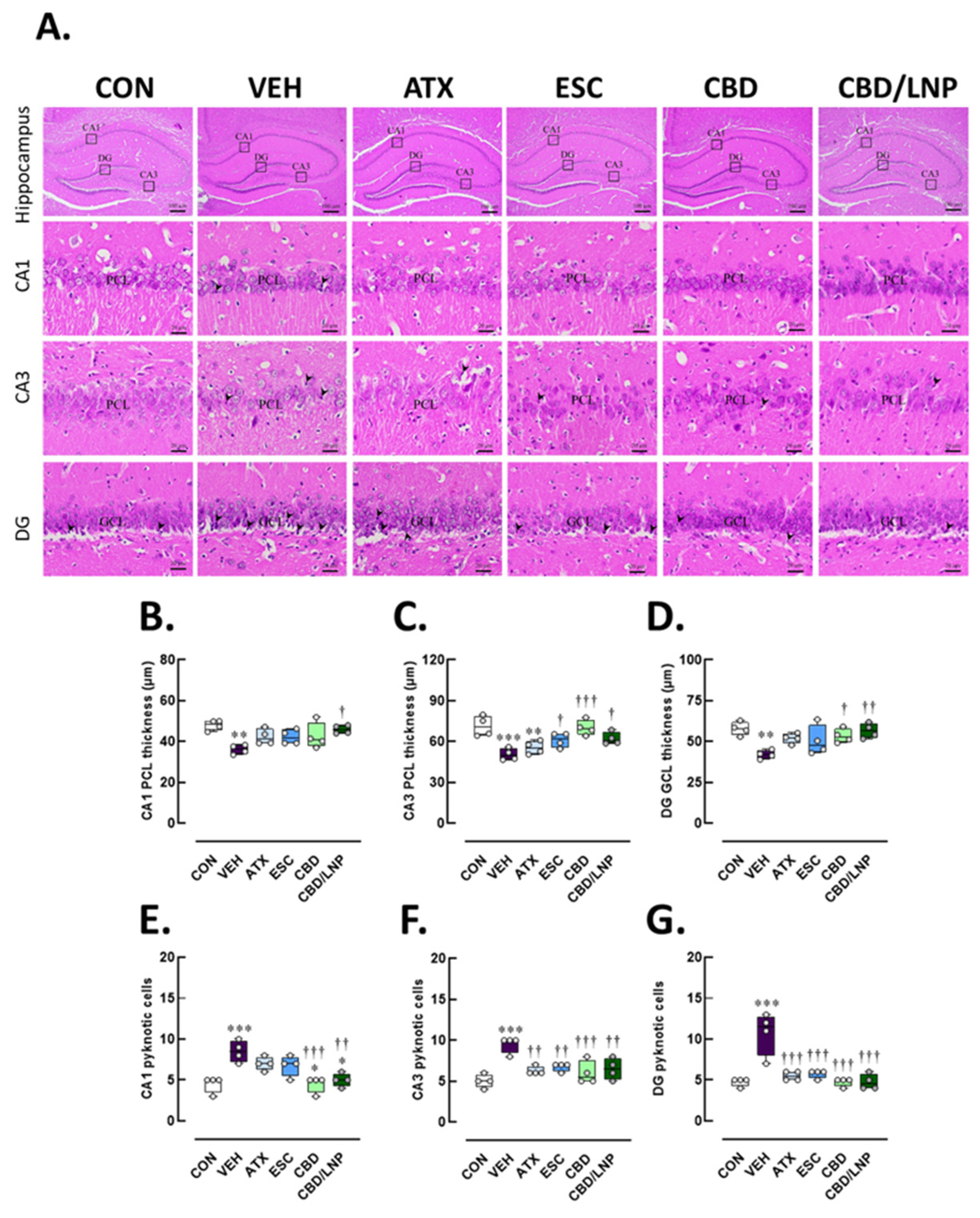 2.4. Restraint-Stressed Male Rats Treated with CBD/LNPs Exhibited Improved Histomorphological Changes in the Hippocampus, Colon, and Tibia, Comparable to the Effects Observed with Monoaminergic Modulators