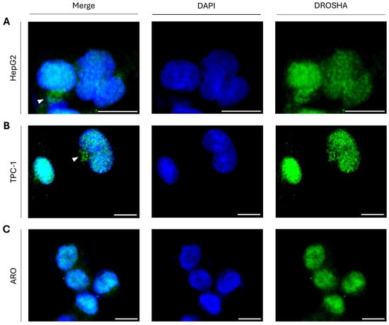 2.3. DROSHA Compartmentalization in the Cytoplasm of Liver and Thyroid Cancer Cells During Interphase