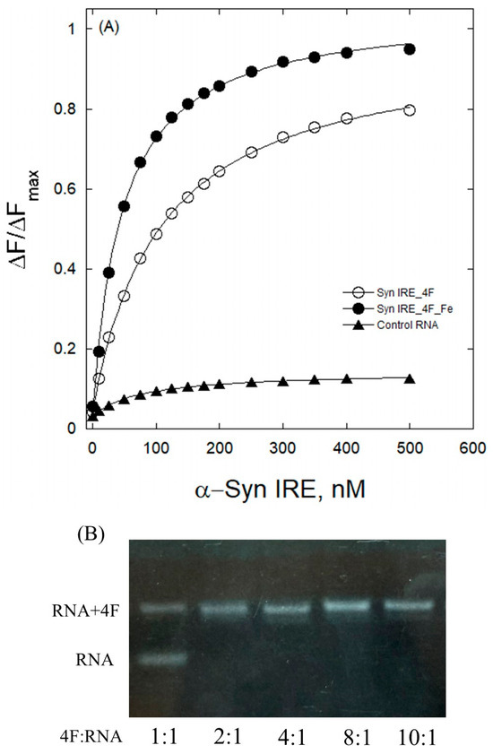 For the titration, we employed a constant eIF4F protein concentration (0.1 μM) in order to analyze the Syn IRE/eIF4F interactions using fluorescence quenching. To collect data using the gel-electrophoretic mobility shift test, similar to previous investigations of IRE/protein complexes, and to assess the potential impact of titrating with varying protein concentrations and employing a constant Syn IRE concentration [35,36], we used the electrophoretic mobility shift test to investigate the Syn IRE/eIF4F interactions. To obtain an eIF4F/Syn IRE molar ratio between 1.0 and 10, a constant Syn IRE concentration (0.1 μM) was combined with a variable eIF4F initiation factor protein concentration (0.1–1.0 μM). The easiest way to see the differences between the Syn IRE and eIF4F interaction in the gels is to compare the unshifted Syn IRE RNA bands (Figure 1B) compared to the Syn IRE/eIF4F complex. The stability of the Syn IRE/eIF4F complex bands in the gels allowed for the direct observation of RNA and protein interactions. There was no change in the reaction mixture when the Syn IRE and eIF4F proteins were added in a different order.