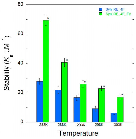 Histogram representation of the temperature-dependent affinity constant for α-Syn IRE with eIF4F with or without Fe2+ (50 μM). The values shown are the average of three separate experiments. * p < 0.01, as determined by Student’s two-tailed t-test; results were significantly different with added Fe2+. The values plotted are means ± S.E. of Syn IRE–eIF4F binding with added iron.