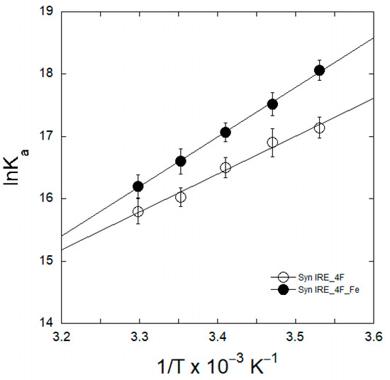 As previously mentioned, we employed temperature-dependent binding constant data to assess the thermodynamics of the association between α-Syn IRE and eIF4F [45]. Thermodynamic measures, including the enthalpy change (ΔH), entropy change (ΔS), and free energy change (ΔG), were used to quantify the participation of the interacting forces for the association of α-Syn IRE with eIF4F. To further investigate the stability of the Syn IRE/eIF4F interaction in the presence and absence of Fe2+, van’t Hoff plots were employed between binding affinity and temperature. The following isobaric approach was used to measure the enthalpy and entropy contributions for the complex formation: