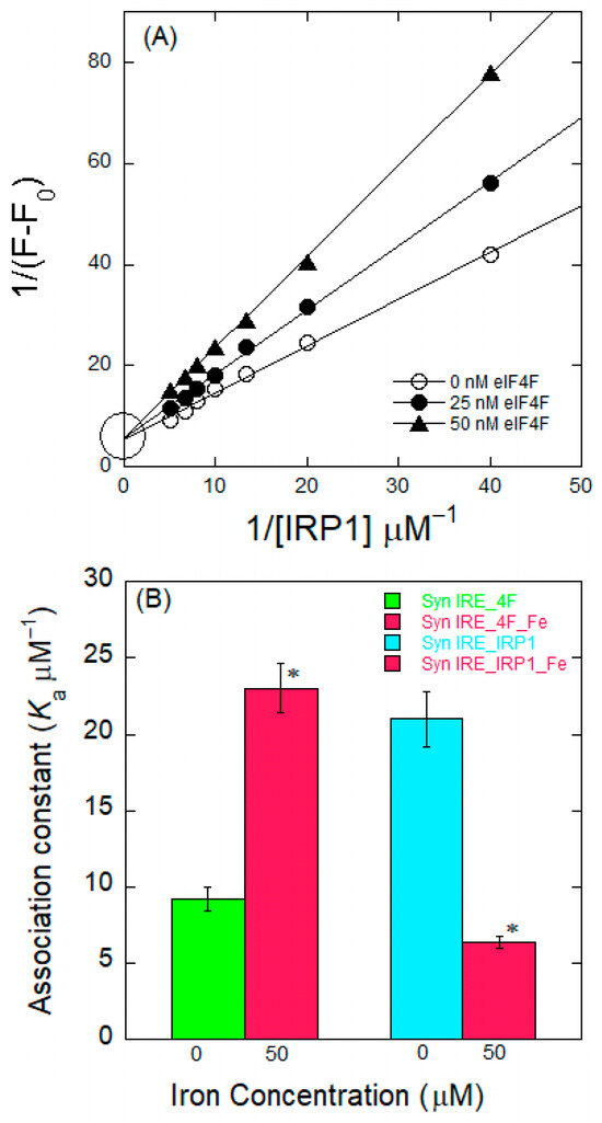 Competitive binding between IRP1 and eIF4F for α-Syn IRE. (A) Plot of 1/ΔF vs. 1/[IRP1] for competitive binding. Fluorescence titration plots for the competitive binding were obtained with Syn IRE as a function of IRP1 at three different concentrations (0, 25, and 50 nM) of eIF4F. Concentration of Syn IRE = 50 nM. (B) Fe2+ effects are opposite for Syn IRE’s association with IRP1 and eIF4F. Binding affinity values of Syn IRE-eIF4F ± Fe2+ were obtained from Figure 1, while those of Syn IRE-IRP1 ± Fe2+ were obtained from [31]. * p < 0.01, as determined by Student’s two-tailed t-test. The values plotted are means ± S.E. of Syn IRE-eIF4F binding with added Fe2+.