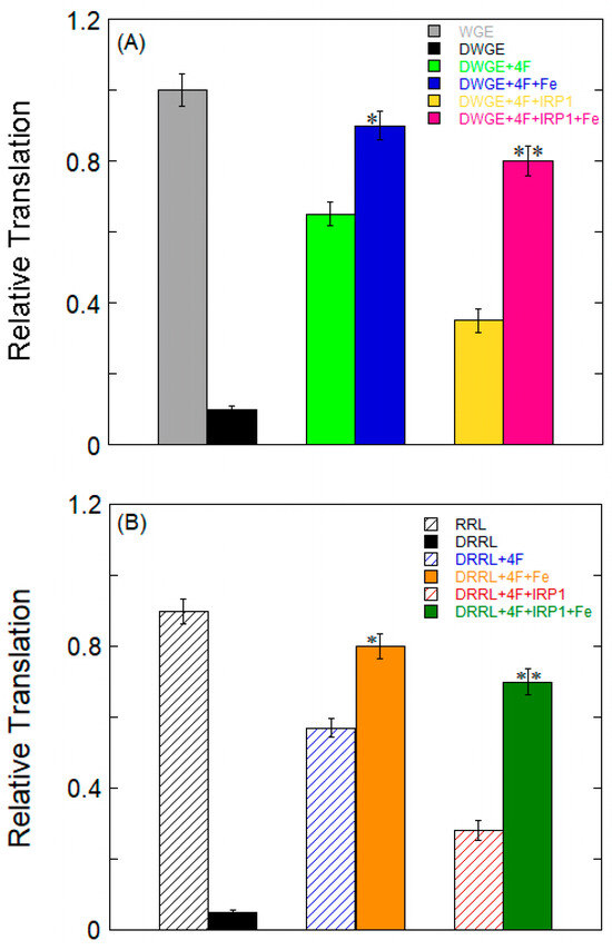 To examine the possible impact of Fe2+ on the translational regulation of protein synthesis in vitro, which is guided by the full-length synuclein mRNA construct, 5′-capped, 3′-polyadenylated mRNA translation was compared in RR lysate and WG lysate. WG lysate and RR lysate were chosen because they have been demonstrated to control ferritin mRNA with translation initiation factors. The preparation of eIF4F-depleted WGE and RRL was carried out as previously described [39,40]. In order to replenish the initiation factor eIF4F during Syn mRNA translation, we used both whole or depleted WG lysate and RR lysate. About 90% less translation occurred when eIF4F was depleted from the WG lysate (Figure 7A) and RR lysate (Figure 7B). By adding exogenous eIF4F, translation was restored to ~65% and 57% for depleted WG lysate and RR lysate, indicating the role of that eIF4F binding to Syn IRE plays in translation. The addition of Fe2+ restored the translation to ~90% and 80% for the depleted WG lysate or RR lysate supplemented with eIF4F. The increase in Syn mRNA translation upon the addition of Fe2+ to the deficient WG lysate combined with exogenous eIF4F demonstrates the role of Fe2+ in improving Syn IRE’s interaction with eIF4F (Figure 6B).