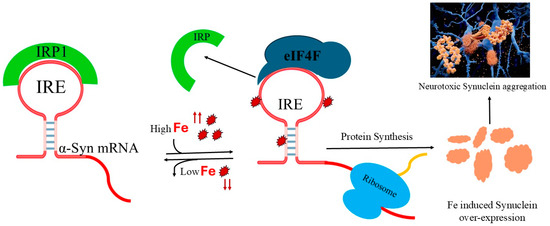 RNA–protein interactions influence α-Syn mRNA splicing, which is essential for many basic biological processes [15]. Interaction of regulatory protein can change the differential translation of a single messenger RNA through selection of a particular translation initiation codon in addition to alternative splicing [16,17,18]. Through the 5′-noncoding region, sequence-specific RNA-binding proteins can effectively suppress translation in mammals [19]. The 3′-UTR is another crucial regulatory element. All mRNAs have this poly(A) tail, which, depending on its length and the binding of specific regulatory proteins, can either upregulate or downregulate translation [16]. An iron-responsive element, whose role in Fe homeostasis has already been documented, is the most well-studied example of a short structural element inside the 5′-UTR that influences the translation of eukaryotic mRNAs. Since the preinitiation ribosomal complex interacts at the site, the stem–loop IRE is often found within fifty nucleotides of 5′-mRNA sites. This distance is crucial for its functionality. Iron-regulatory proteins (IRPs) bind to IRE and regulate translation. Recently, a functional stem–loop IRE linked to the expression of α-Syn and an amyloid precursor protein (APP) have been reported [20,21]. It was reported that this IRE conferred iron-dependent regulation and was similar to those identified in the 5′-noncoding regions of the mammalian TfR and ferritin RNAs. The 5′-UTR of α-Syn mRNA contains a structured IRE that controls translation. By a mechanism akin to ferritin mRNA, iron was shown to regulate the translation of α-Syn [22]. At low iron concentrations, IRP binds to stem–loop IRE. At high concentrations, IRP frees the mRNA to undergo translation [23,24]. Translational regulation of α-Syn via Fe2+, IRE, and Fe in Lewy bodies supports their combined roles in PD [25,26].