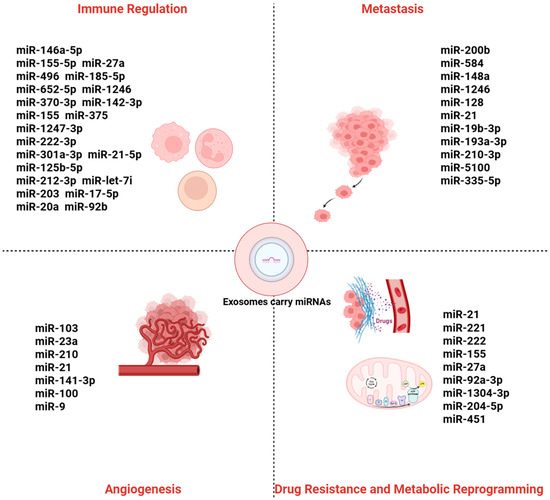 Roles of exosomal miRNAs in tumor progression. Exosomal miRNAs can accelerate tumor metastasis, induce angiogenesis, enhance drug resistance and tumor metabolic reprogramming, and contribute to the formation of a tumor-promoting and immunosuppressive microenvironment.