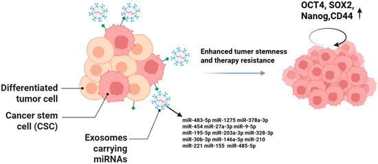Exosomal miRNAs can enhance the stemness of CSCs, which is primarily manifested by increased expression of stemness markers, enhanced tumorsphere-forming ability, and strengthened self-renewal capacity.