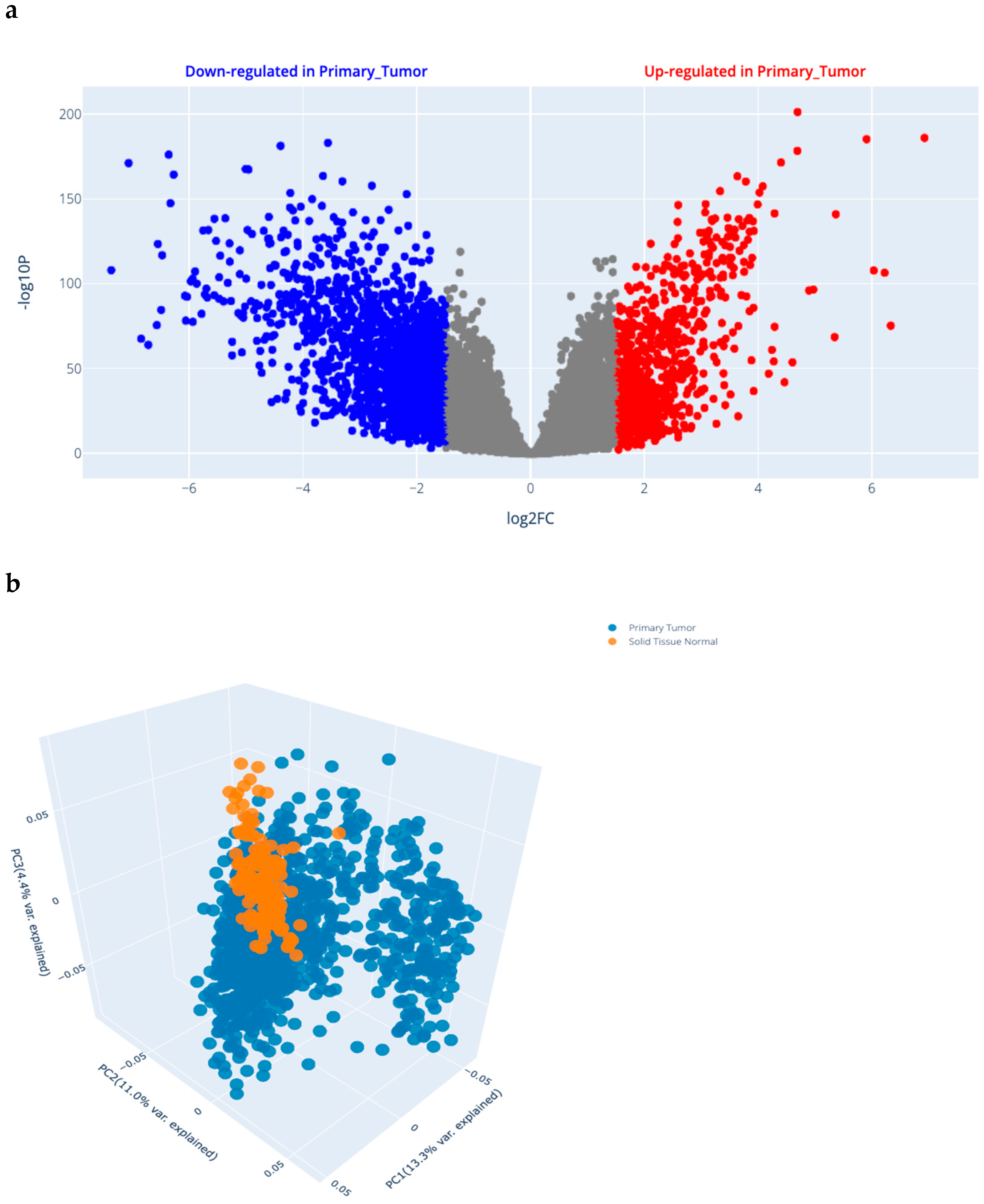 Xena DGE analysis was run using gene expression data for primary tissue vs. solid normal tissue, and the gene expression dataset was IlluminaHiSeq. Gene expression data was normalized (Z normalization), applied to convert raw read counts into informative measures of gene expression and to remove factors that affect the analysis. The PCA 3D QC scatter plot for samples is presented in Figure 1b. DEGs, (16,701) using limma_voom with their Log2FC, average expression, and p-value, are attached as a Supplementary Excel File S1. Supplementary Table S1 addresses the top 10 upregulated genes from DGE analysis.