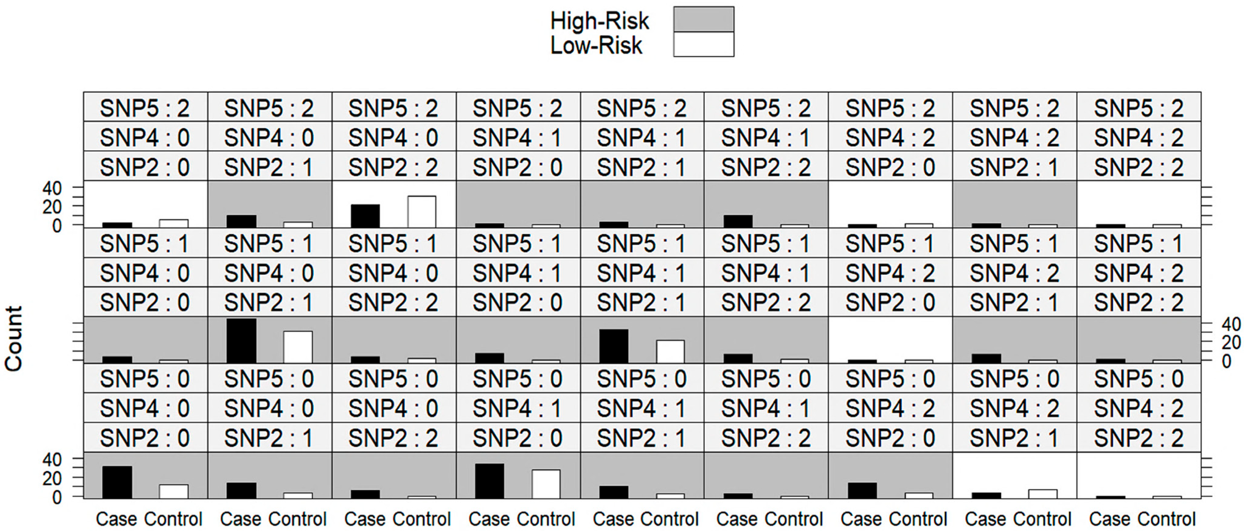The MDR approach was utilized to reduce the dimensionality of the problem by identifying the most informative combinations of SNPs that contribute to the outcome of interest. Table S14 showed that the best-performing model with three SNPs (SNP2, SNP4, and SNP5) showed the highest accuracy in all sets, especially with a validation accuracy of 72.1%. This indicates that the interactions between these three SNPs contribute more to predicting the outcome than any one or two-SNP models.