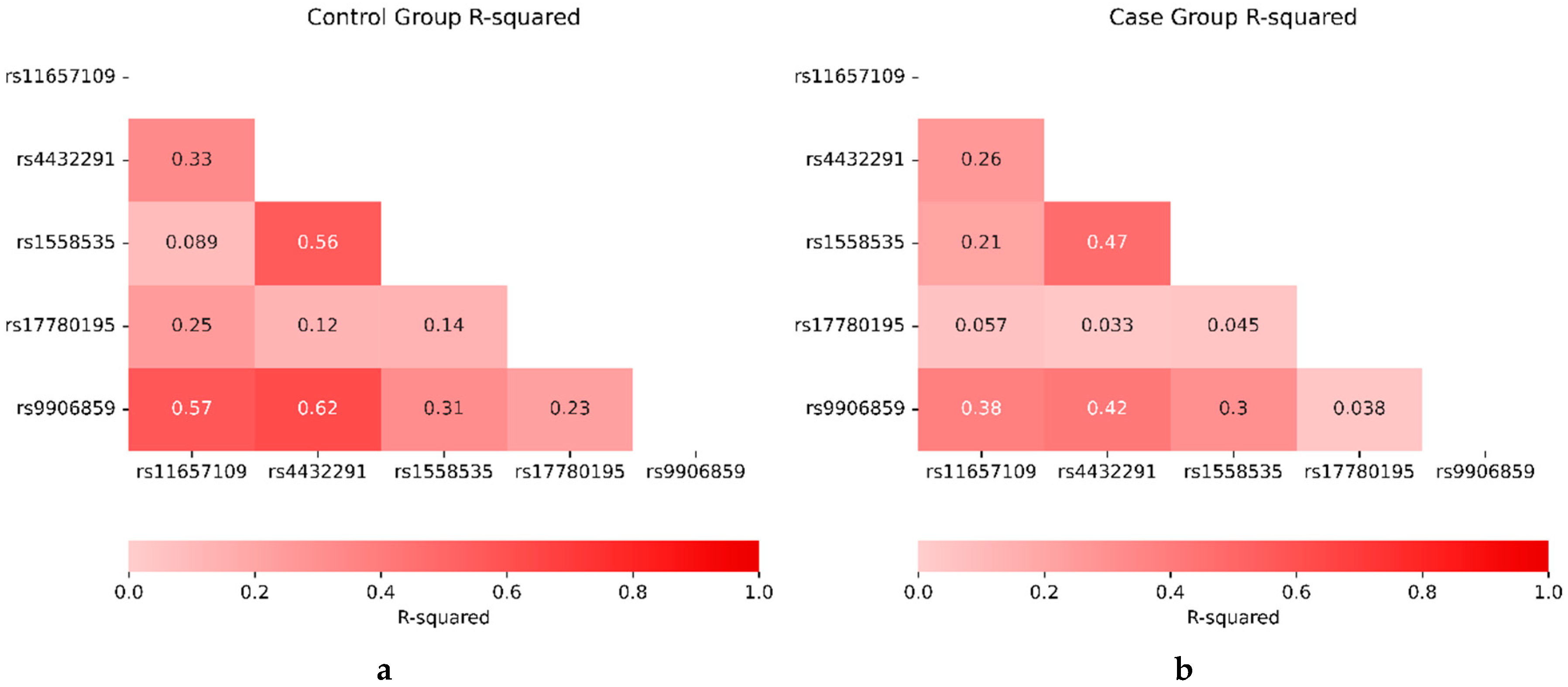 In contrast, the case group (right panel) presented noticeable differences in linkage patterns. While some SNP pairs, like rs4432291 and rs9906859, still maintained a relatively strong correlation (R2 = 0.42), the overall linkage between SNPs was weaker compared to the control group. For example, the correlation between rs11657109 and rs9906859 dropped to 0.38, indicating a reduction in the strength of linkage disequilibrium between these two SNPs in the case group. This weakening of correlations suggests that in individuals with BC, these SNPs are inherited in a more independent manner, possibly due to genetic recombination events or other population-specific factors. The differences in R2 between the two groups hint at variations in the underlying genetic architecture, which may be influenced by disease-associated genetic regions or population stratification.