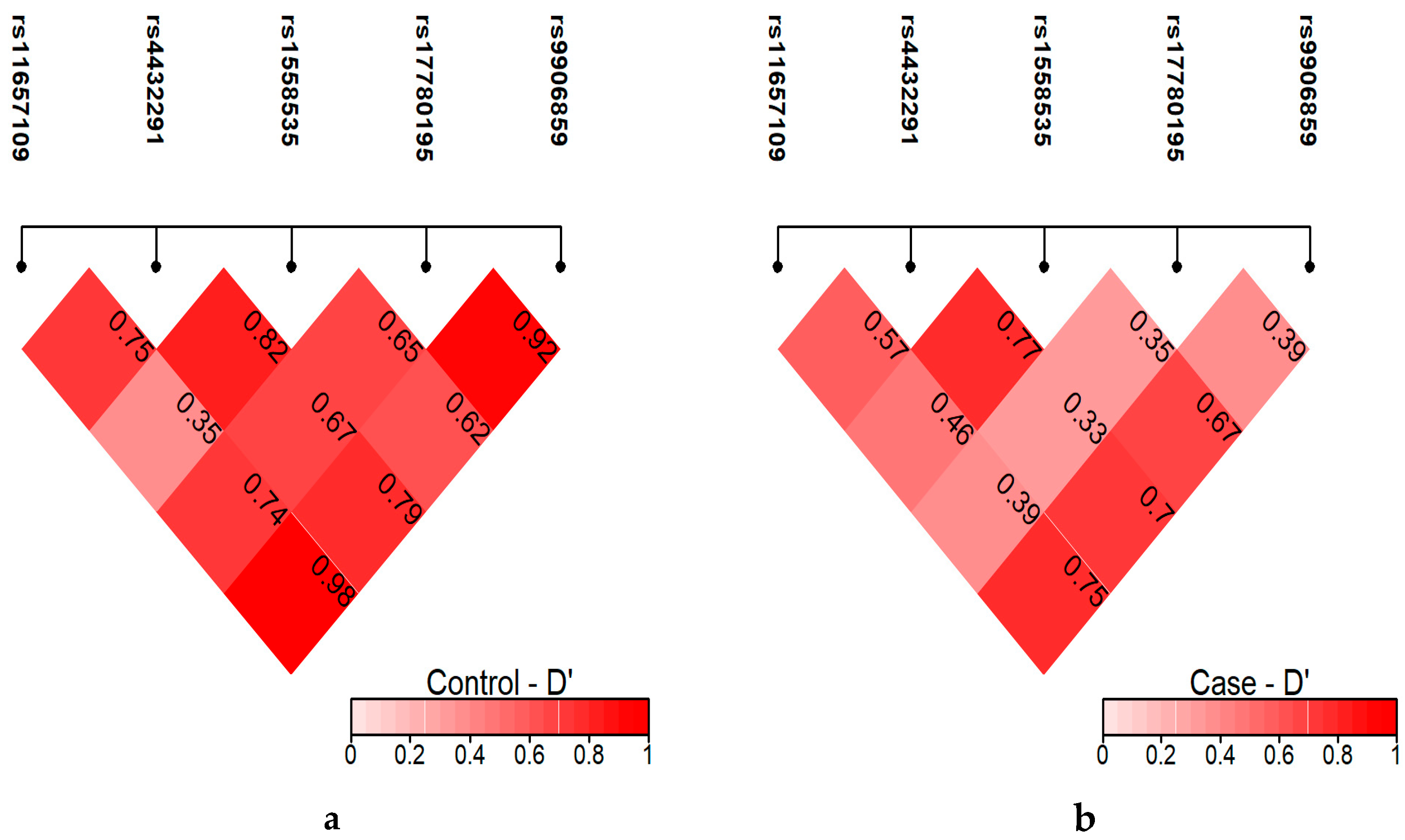2.13. Haplotype Analysis of the Five SNPs in LINC00511