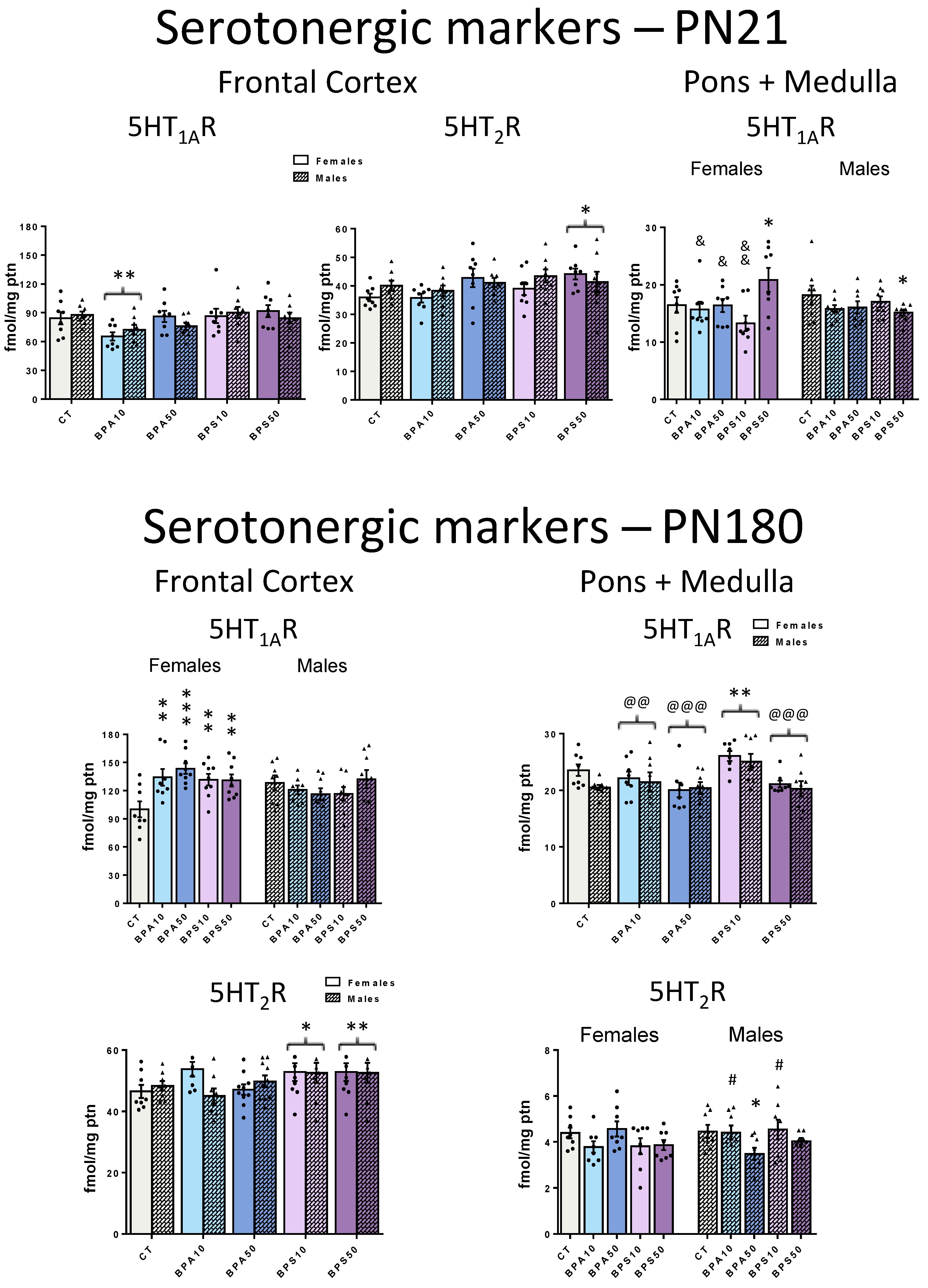 - Castro, B.; Sánchez, P.; Torres, J.M.; Ortega, E. Bisphenol A, bisphenol F and bisphenol S Affect Differently 5α-Reductase Expression and Dopamine–Serotonin Systems in the Prefrontal Cortex of Juvenile Female Rats. Environ. Res. 2015, 142, 281–287. [Google Scholar] [CrossRef]
