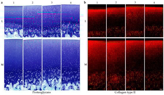 Histological and immunohistochemical staining of porcine cartilage tissue at eight anatomically defined localisations, M1–M4: medial samples, L1–L4: lateral samples. (a) Staining for proteoglycans with toluidine blue and counterstaining with fast green. (b) Staining for collagen type II (antibody details in Table 1, methods), secondary antibody: Alexa Fluor 594 goat anti-mouse (details in Section 4); scale is 100 µm. All microscopic images were taken with the Keyence fluorescence microscope BZ-X810.