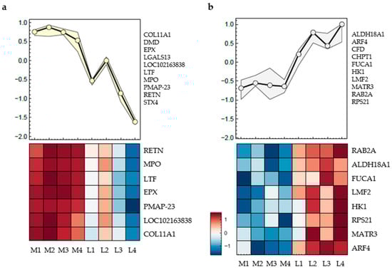 Proteomic profiles of porcine cartilage tissue (n = 3) at eight anatomically defined localisations, M1–M4: medial samples, L1–L4: lateral samples. The curves (upper part) represent the mean expression curve of all proteins in the cluster, the heatmaps include proteins without missing data; only proteins with significantly different regulation between positions are shown. q-value < 0.01 was considered statistically significant. (a) Cluster 1: Significantly regulated proteins following a medial-to-lateral decreasing trend; (b) Cluster 2: Significantly regulated proteins following a medial-to-lateral increasing trend. List of all proteins are given in the text below, heatmaps represent the mean value of three individual knee joints.