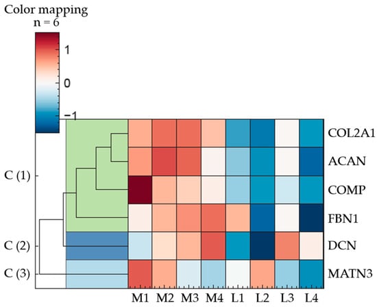 Regulation of ECM proteins in porcine articular cartilage (n = 3); eight anatomically defined localisations, M1–M4: medial samples, L1–L4: lateral samples. q-value < 0.01 was considered statistically significant. The heatmap illustrates ECM proteins in three expression clusters; Cluster 1: COL2A1, ACAN, COMP, FBN1; Cluster 2: DCN; Cluster 3: MATN3; description of the proteins are given in the text below, the heatmap represents the mean value of three individual knee joints.