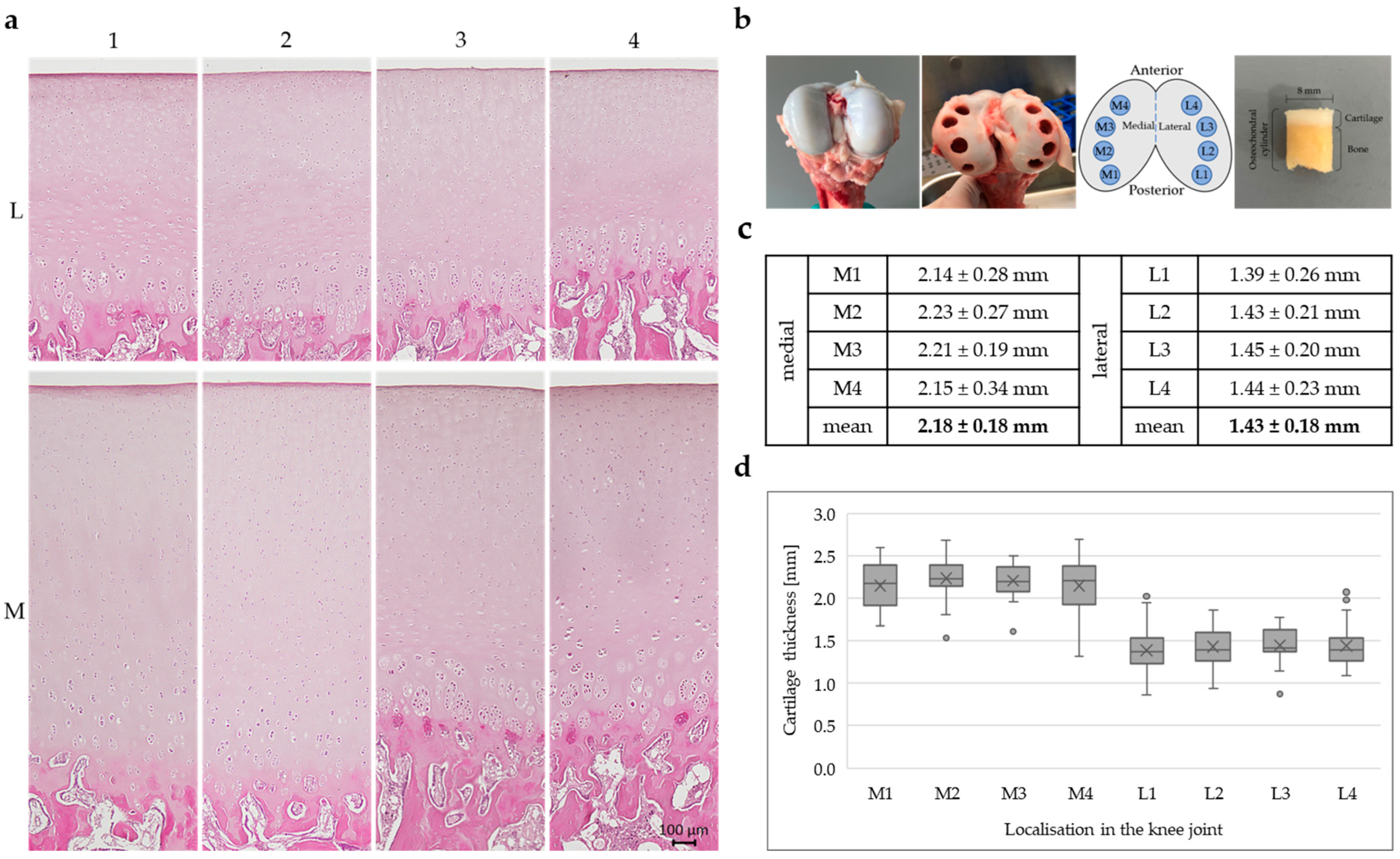 (a) Representative H&E staining of porcine cartilage tissue (n = 3) at eight anatomically defined localisations; scale is 100 µm, all microscopic images were taken with the Keyence fluorescence microscope BZ-X810. (b) Healthy porcine articular cartilage before and after sampling; sampling localisations, four medial (M1–M4) and four lateral (L1–L4) positions; porcine osteochondral cylinder with a diameter of 8 mm. (c) Cartilage thickness determined from cartilage sections of 33 individual knee joints (n = 33); statistical analysis was performed using a linear mixed-effect model: lateral cartilage thickness was 0.68 mm lower than medial thickness (β = −0.678, SE = 0.068, t(149) = −9.93, p < 0.001, 95% CI [−0.813, −0.543]). (d) Box plots show the interquartile range of cartilage thickness for all eight positions (n = 33), horizontal line: median, cross: mean value, dots: individual outliers.