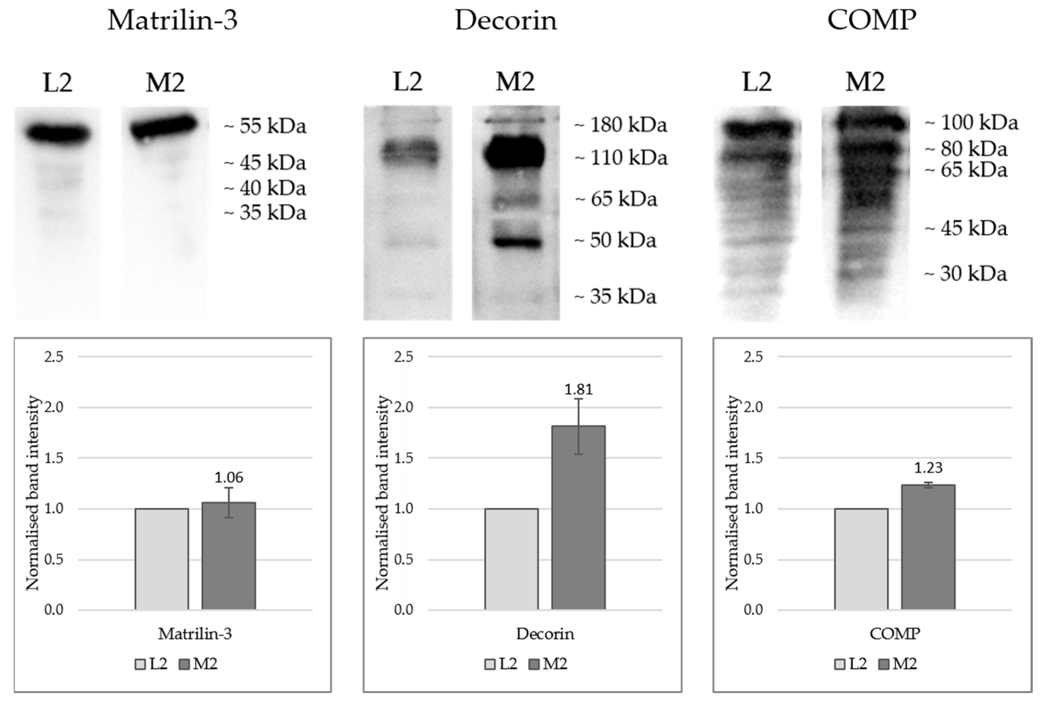 Figure 5 presents the Western blot results, showing both the band patterns and the normalised band intensities in graphical form. Quantitative proteomic analysis indicated equivalent expression levels of matrilin-3 at positions L2 and M2. This was further supported by Western blot detection of the 55 kDa monomer, which showed comparable signal intensities (L2 = 1.0; M2 = 1.06) in both samples with no significant deviation (p = 0.62).