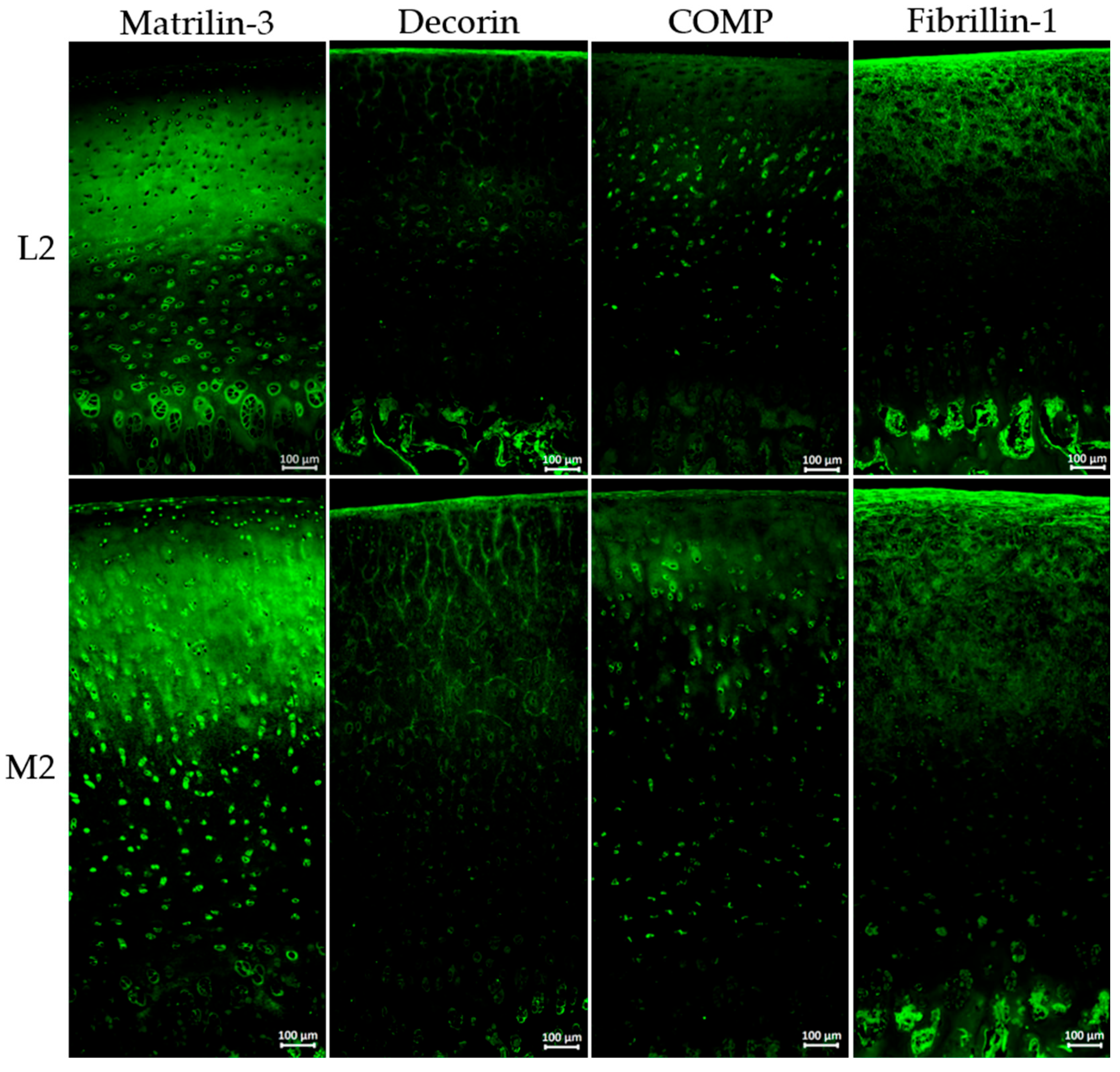 Figure 6 illustrates representative immunohistochemical staining of three individual knee joints (n = 3) of matrilin-3, decorin, COMP, and fibrillin-1 at the localisations L2 and M2, visualised by green fluorescence.