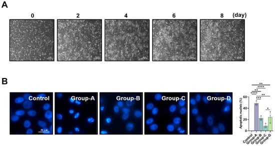 Nuclear fragmentation and chromatin condensation were detected via 4′,6-diamidino-2-phenylindole (DAPI) staining. Cells (105 cells/well) were cultured in 6-well plates with dexamethasone (10 μM) in DMEM containing 2% horse serum at 37 °C for 48 h. Cells were distributed onto slides, covered with mounting medium and cover slips, and visually analyzed with a Leica EL6000 fluorescence microscope (microscope, Leica Microsistems GmbH, Wetzlar, Germany).